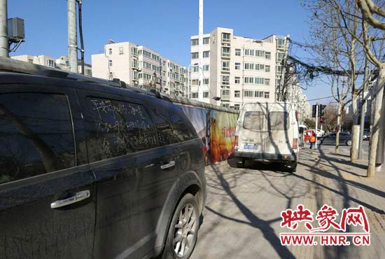 3月26日下午15時(shí)30分左右,在汝河路昆侖路交叉口西北角人行道上,一輛黑色越野頭東尾西的停在汝河路北邊的人行道上,右邊車窗上有人用黃色粉筆寫了兩行大字提醒車主把車挪走。