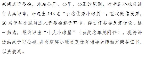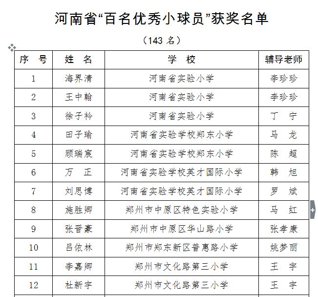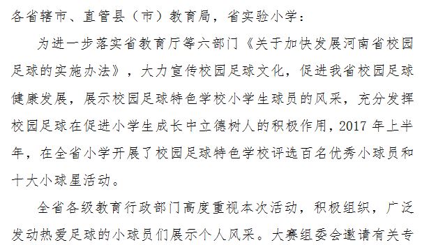 6月6日,河南省教育廳正式發(fā)文,向全省教育系統(tǒng)公布河南省首屆校園足球“百名優(yōu)秀小球員和十大小球星”的評選結(jié)果。