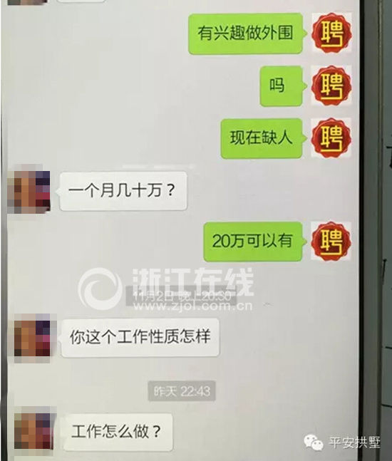 這個(gè)人自稱(chēng)“安遠(yuǎn)”,在微信里直接問(wèn)趙小姐是否想做“外圍女”賺錢(qián),還特意提到收入頗豐。她想了想,回復(fù)了三個(gè)字:有興趣。然后,兩人留了電話(huà),約定再聯(lián)絡(luò)。