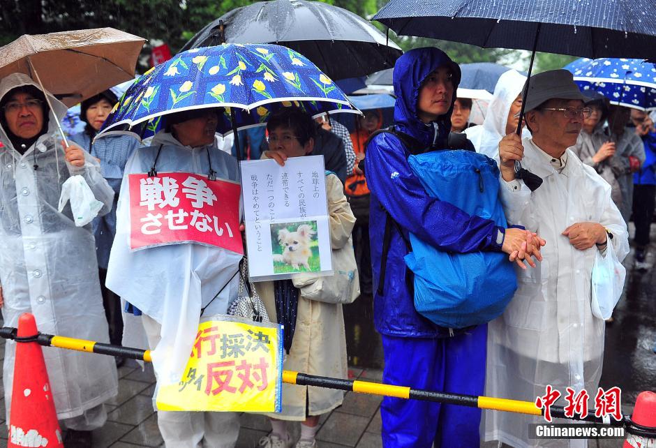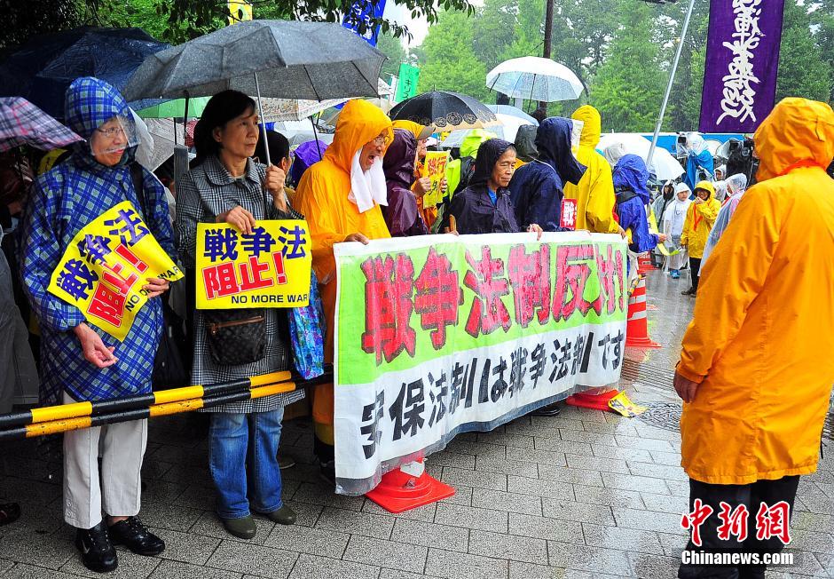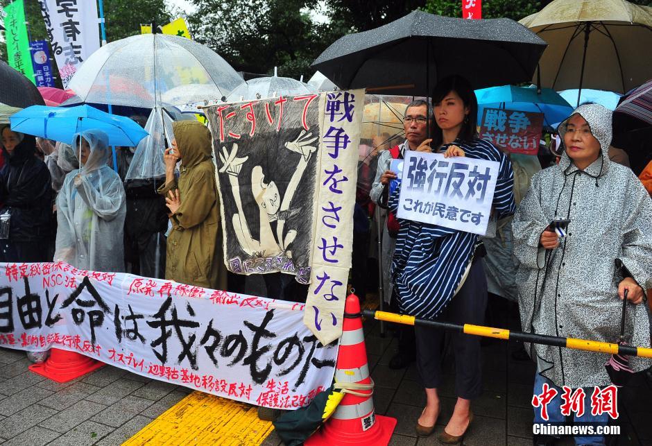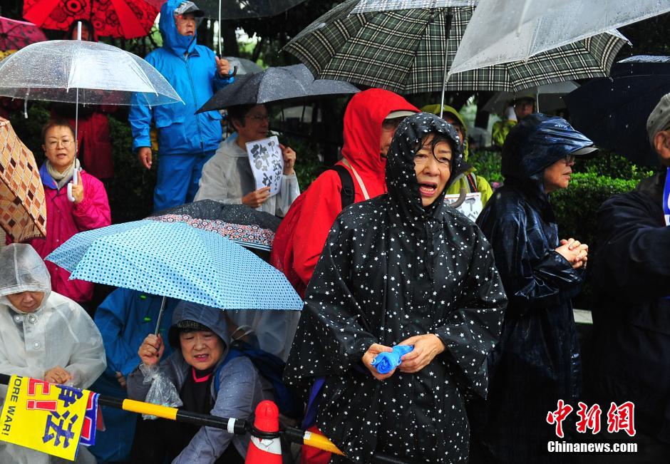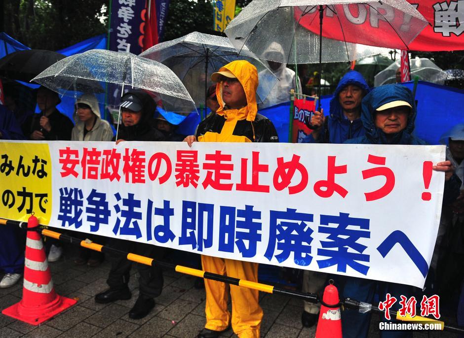 隨著安倍陣營(yíng)強(qiáng)推以解禁集體自衛(wèi)權(quán)為核心內(nèi)容的安保法案最終過(guò)關(guān)的計(jì)劃進(jìn)入“倒計(jì)時(shí)”,日本民眾的反安保抗議活動(dòng)再度進(jìn)入高潮。在之前徹夜抗議之后,9月17日白天,又有眾多日本民眾冒著大雨持續(xù)聚集在國(guó)會(huì)周邊進(jìn)行抗議活動(dòng)。中新社發(fā) 王健 攝