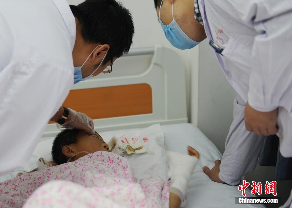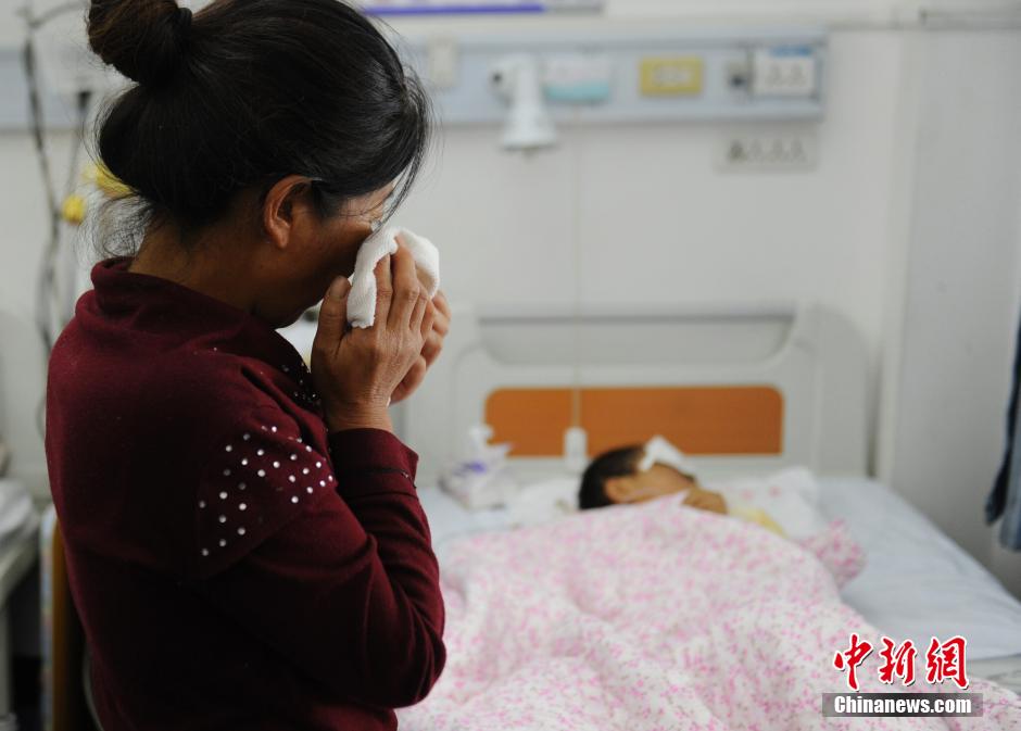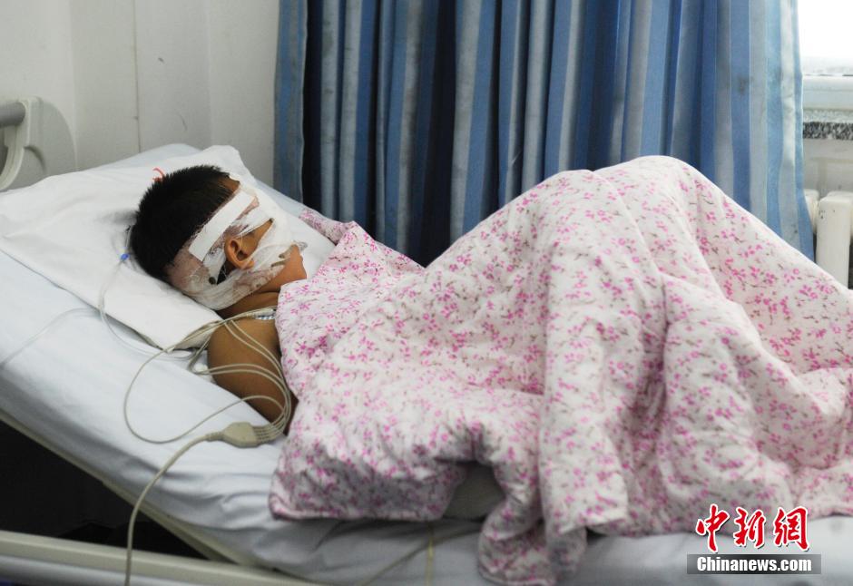 10月13日,12歲的朱某正在吉林大學(xué)第二醫(yī)院接受治療。據(jù)其家人介紹,10月11日,朱某獨自在家,遭同村村民王某挖出雙眼,行兇者還點燃了他家的房子,朱某靠裝死逃過一劫。王某事后自殺。目前雖經(jīng)手術(shù)治療,但朱某右眼視力已無恢復(fù)的可能,左眼亦不樂觀。警方正對此案進(jìn)行調(diào)查。中新社記者 張瑤 攝