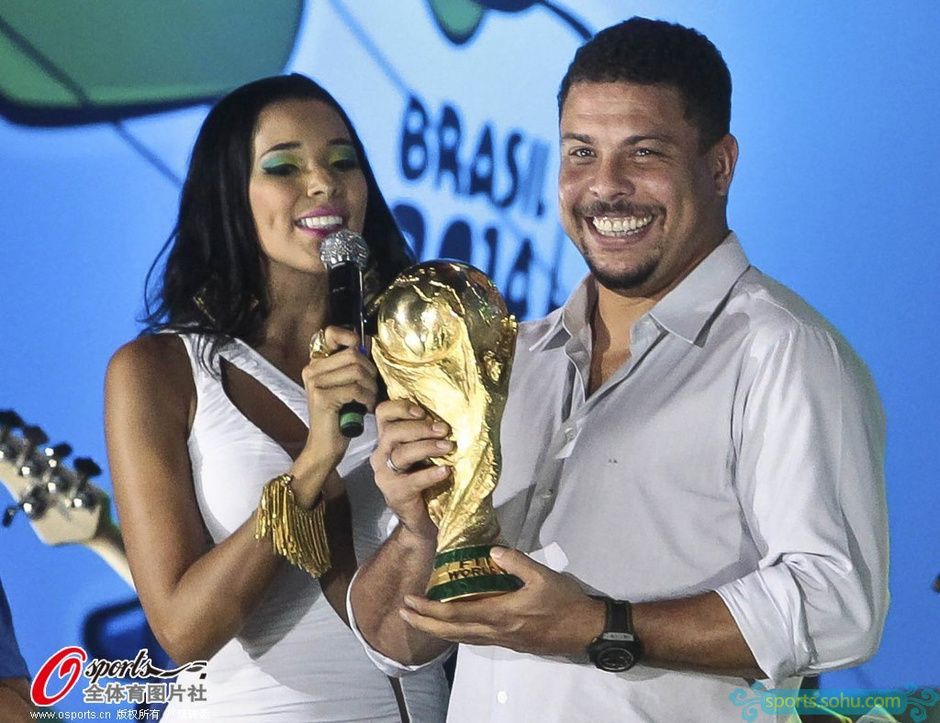 2014年世界球迷盛會上羅納爾多展示大力神杯,他曾在1994年和2002年兩度帶領巴西隊獲得大力神杯。圖為羅納爾多展示大力神杯。