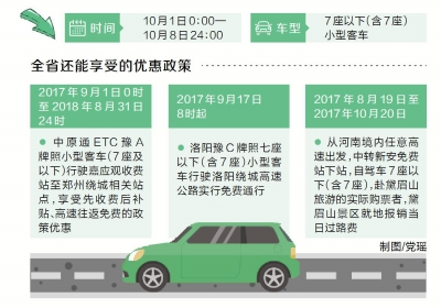 同時(shí),全省還能享受到除高速免費(fèi)以外的其他優(yōu)惠政策:從2017年9月1日0時(shí)至2018年8月31日24時(shí),中原通ETC豫A牌照小型客車(7座及以下)行駛嘉應(yīng)觀收費(fèi)站至鄭州繞城相關(guān)站點(diǎn),享受先收費(fèi)后補(bǔ)貼、高速往返免費(fèi)的政策優(yōu)惠;2017年9月17日8時(shí)起,洛陽豫C牌照7座以下(含7座)小型客車行駛洛陽繞城高速公路實(shí)行免費(fèi)通行;2017年8月19日至2017年10月20日,從河南境內(nèi)任意高速出發(fā),中轉(zhuǎn)新安縣下站,自駕7座以下(含7座)小型客車赴黛眉山旅游的實(shí)際購票者,黛眉山景區(qū)就地報(bào)銷當(dāng)日過路費(fèi)。