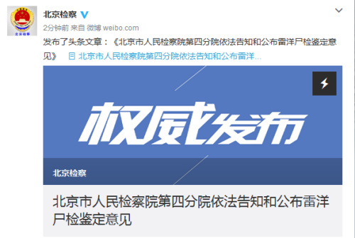 6月30日,北京市人民檢察院第四分院向雷洋死亡案件涉案警務(wù)人員及其家屬、雷洋家屬及雙方聘請(qǐng)的律師依法告知了雷洋尸檢鑒定意見(jiàn)。